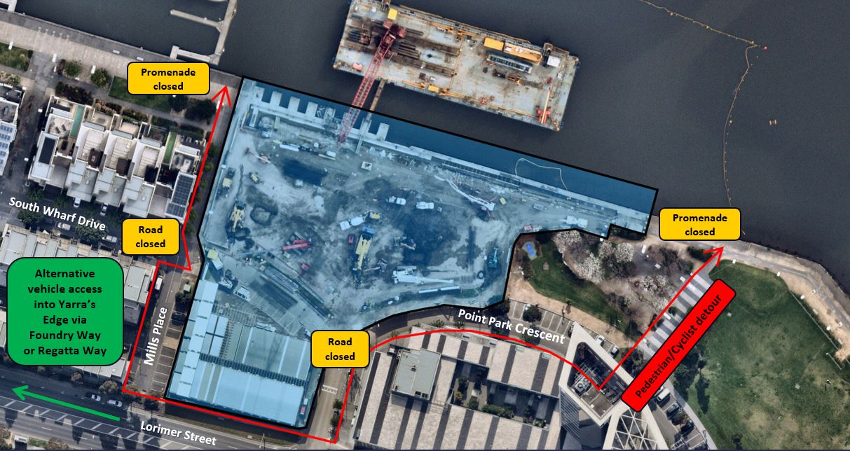 The site tower and promenade site has been hoarded off which restricts vehicular and pedestrian access to a short stretch of South Wharf Drive as well as the waterfront promenade. Traffic signage for vehicles and pedestrians will be placed around the updated site boundary indicating road closure and detour routes. Please see the map below for more details.